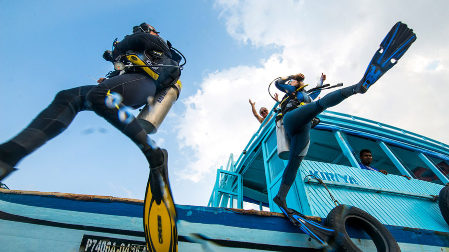 The professionally run dive centre offers daily diving by traditional dhoni to a variety of enchanting dive sites including coral gardens, manta cleaning stations, thilas, walls, caverns, caves and the Filladhoo wreck which is a refuge for plenty of marine life. A full range of PADI courses are available to book.