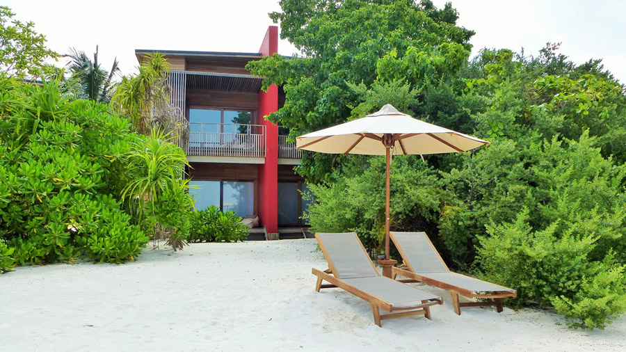 Situated within an almost untouched forest , the resort sits alongside half a mile of white sand beach and a stunning turquoise lagoon. Facilities include a beachside restaurant offering buffet style local and Mediterranean cuisine, juice bar, saltwater swimming pool, gym, non-motorised water sports, daily yoga, kayak tours, bicycles, a spa (Ayurvedic and classic treatments) dive centre and a boutique. The boat bar, the Black Pearl, is moored in the lagoon where you can enjoy a post-dive alcoholic beverage.