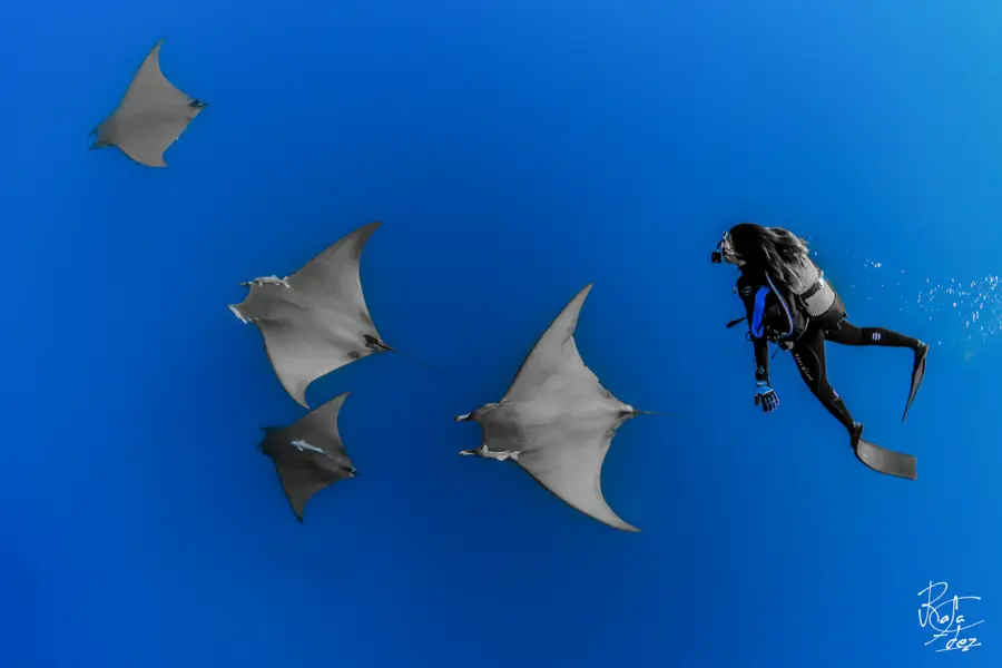 The exceptional oceanic currents around Santa Maria create opportunities for encounters with pelagic species, with the famous Baixa do Ambrósio site offering one of the Atlantic's most reliable mobula ray aggregations during the summer months. Here, divers descend to a mooring line suspended in the blue water, where schools of sicklefin devil rays (Mobula tarapacana) gather to feed in the current, sometimes accompanied by barracuda, tuna and other pelagic species. The Formigas & Dollabarat marine reserves, whilst requiring longer boat journeys, reward divers with pristine offshore visibility and frequent sightings of manta rays, whale sharks, dusky groupers and various shark species.