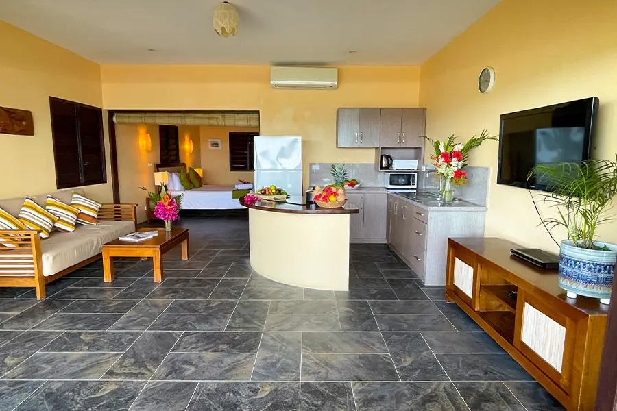The resort offers a range of accommodation options to suit various needs and budgets, ranging from garden view studios through to an elegant two-bedroom sea view apartment. Garden view studios are generous at 57 square metres, and offer a view of the garden and swimming pool. Features include a king-size bed, a second single bed, kitchen area, bathroom and an outdoor seating area. Beachfront studios are the same size, but with views of the ocean.