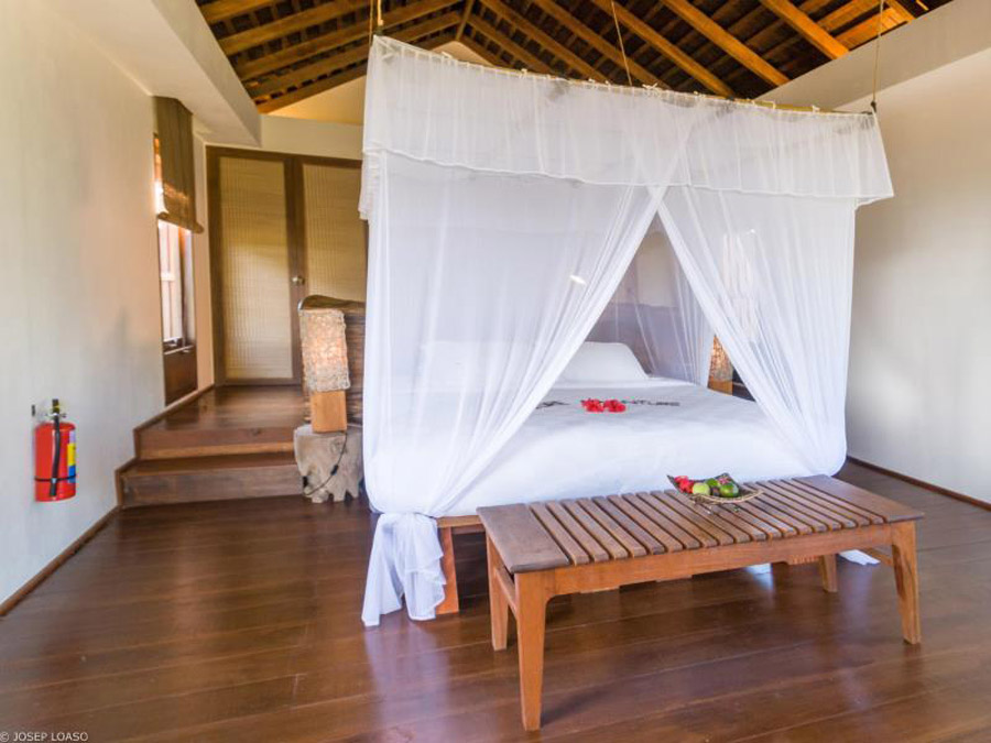 Designed to reflect the local landscape, the resort has been built using indigenous materials and offers five room categories for all budgets. The Lumbung suites are set in lush tropical gardens and feature an air-conditioned bedroom with double bed on the top floor with a bathroom, living room and spacious sun deck on the ground floor. These charming and comfortable suites are uniquely appointed and inspired by local rice barn structures. The Bay View suites are simple stand-alone timber villas complete with fantastic views from the terrace and a secret garden at the back. They have a double bed, air-conditioning and a partially open-air bathroom. In addition, there are four Mangrove suites and two family Bay View suites. For the budget conscious, the garden rooms are cosy with a double bed and small private garden area and the basic Kura Kura rooms are located on stilts at the edge of the bay beside the mangroves.