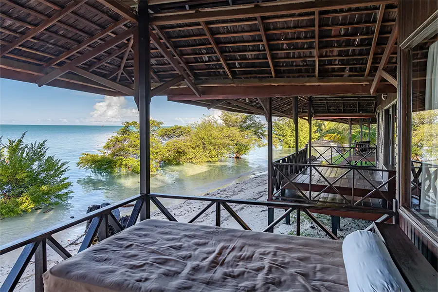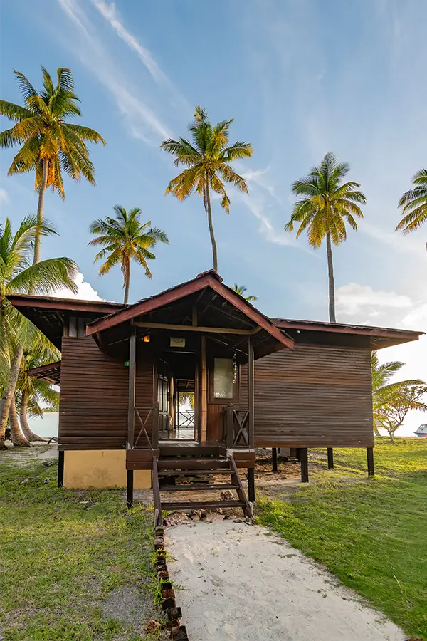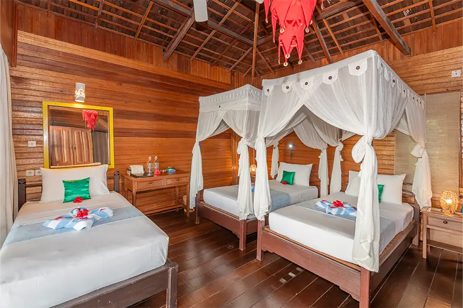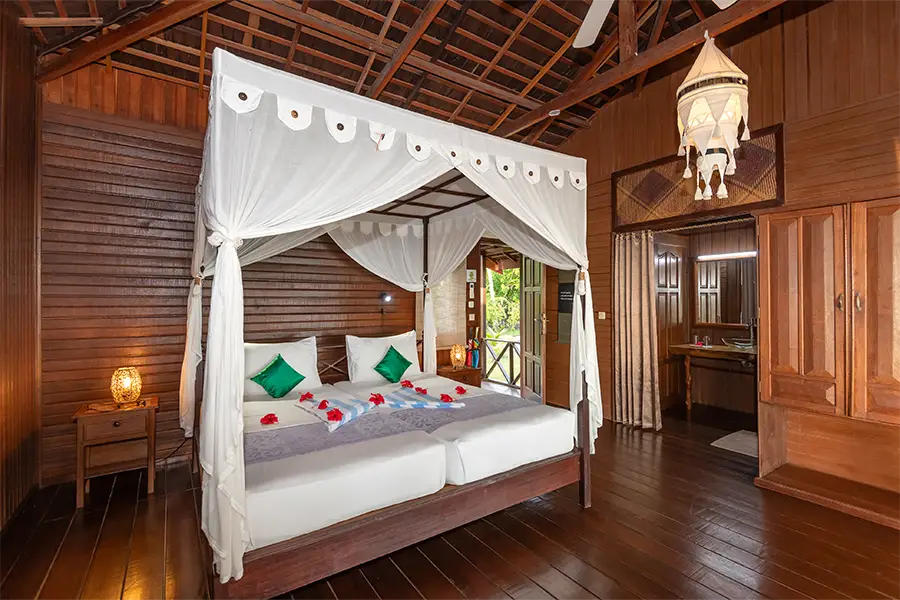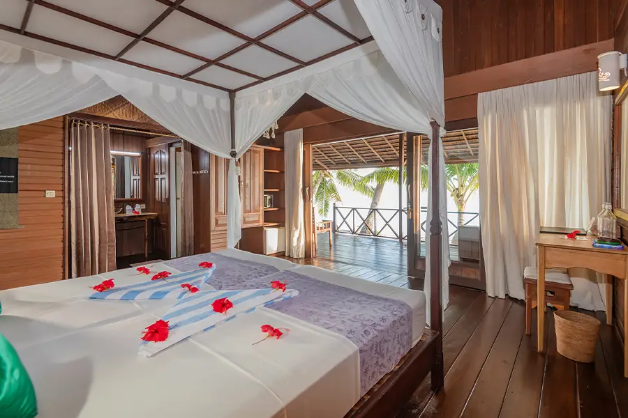Dotted along the white sandy beach, the 22 stylish and spacious bungalows are air-conditioned and furnished with a four-poster bed. They all feature a semi-open bathroom with hot and cold water and great views of the lagoon, mini bar, safety box and a private verandah with day bed.