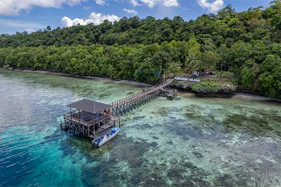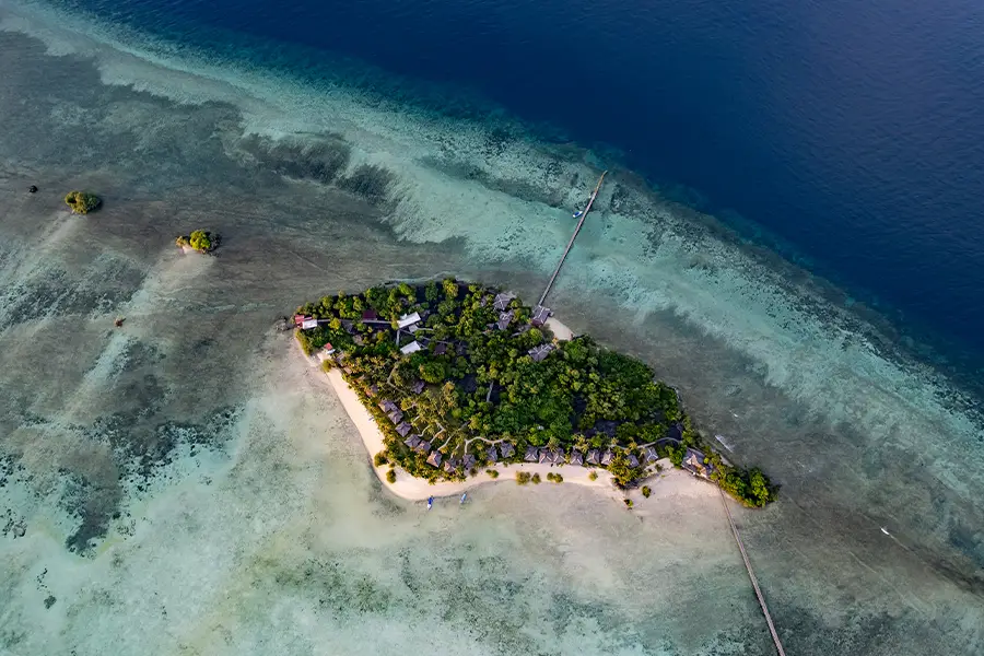 The Nunukan Resort is located at the southern end of the Maratua Atoll, built to very strict ecological standards and comprises two areas; the main buildings overlook the long jetty and open sea on the northeast side of the island, whilst the lavish guest bungalows are nestled in the tropical landscaped gardens overlooking the lagoon on the west. A wooden boardwalk connects the two areas.