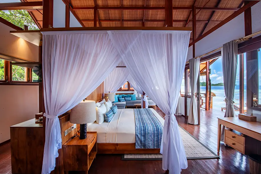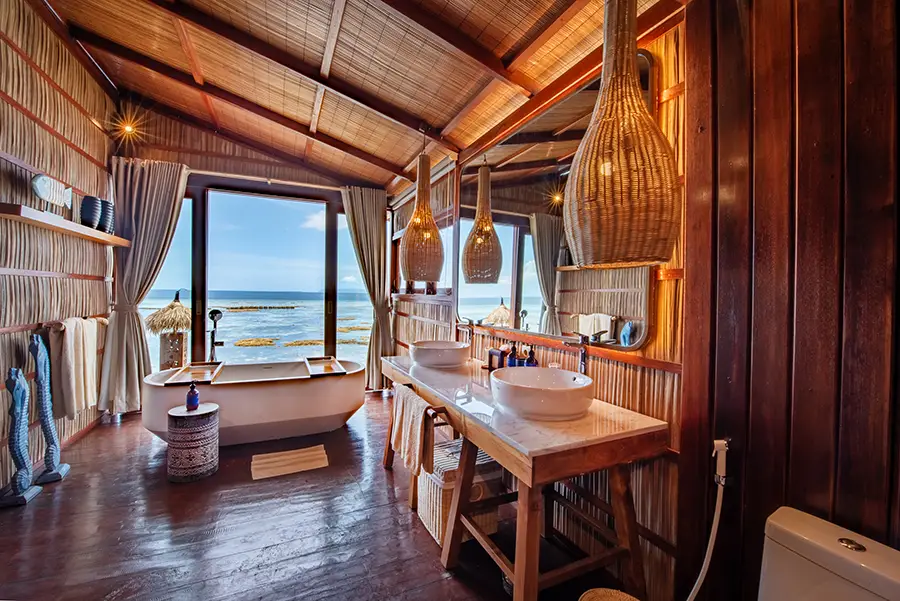 The resort features 28 traditionally-built overwater bungalows, cooled by natural ventilation, featuring a semi-closed private bathroom, personal safe, and hair dryer. The Superior Bungalows are spacious and built with traditional materials, furnished with a hammock on the verandah overlooking the Pacific Ocean. The elegant and spacious Deluxe Bungalow maintain a traditional charm, feature a four-poster bed and offer panoramic views from the verandah which has both a day and sun beds. The Premier Bungalows are the only rooms with air-conditioning and are the largest of the overwater bungalows. They come complete with bath with ocean views and double vanity, these gorgeous bungalows provide the ultimate blend of natural scenery and comfort. Some bungalows can facilitate twin beds. Please note, there's no direct access to the water from the rooms.