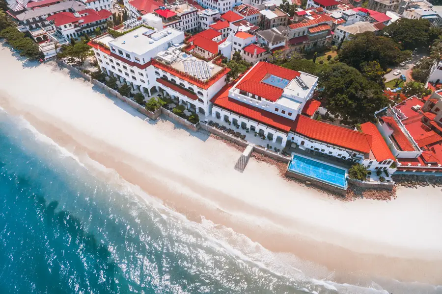 The hotel features 67 rooms and suites, each combining modern comfort with authentic Zanzibari design. Guests can choose between ocean or city views, with all rooms offering private balconies or patios and beautifully decorated en suite bathrooms.