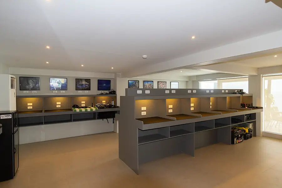 The camera room is expansive with 28 individual work stations, charging points, and dedicated rinse facilities. Underwater photographers who are looking to develop their craft can participate in workshops and utilise tuition. Options are available for shooting technicalities including blackwater techniques, macrophotography, and wide-angle exploration, all the way to an introduction to post-processing. Contact us to discuss your specific underwater photography requirements.