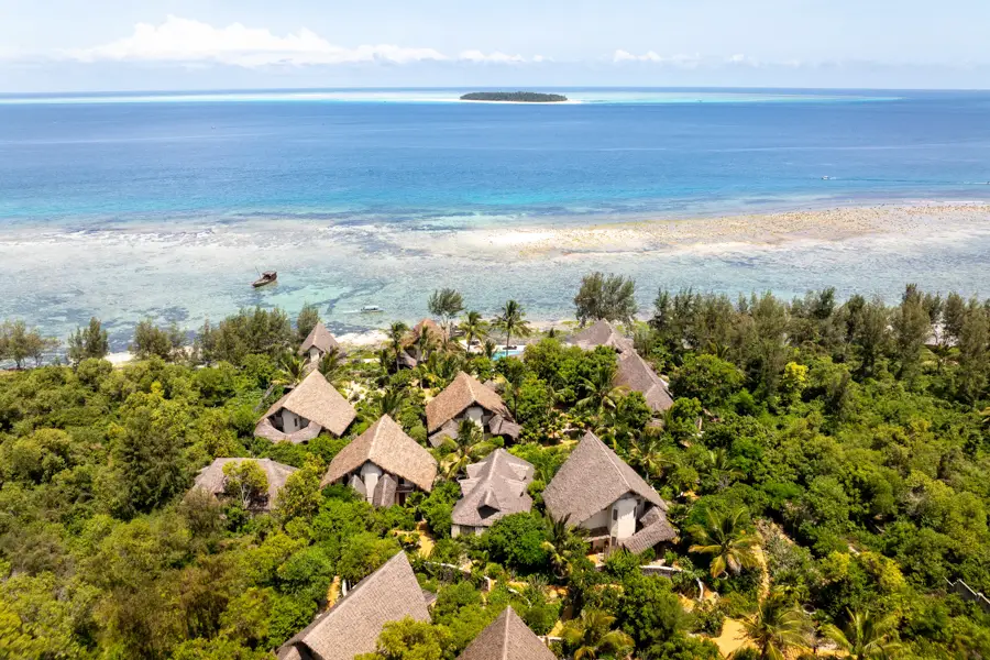 Sunshine Marine Lodge sits on a low rock cliff above the Indian Ocean, surrounded by beautiful Zanzibari tropical palm gardens with a view of Mnemba Island in the distance. Blending modern style with Swahili tradition, it’s located near the quiet Matemwe fishing village, offering a peaceful escape from busy tourist areas. Divers especially love its proximity to Mnemba Atoll, a protected area just a short boat ride away that's famous for stunning coral reefs, abundant tropical fish, and bottlenose dolphins.