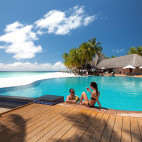 Dining options include the Dhonveli restaurant, where all buffet style meals are taken, Madivaru seafood and grill (a la carte) and two bars with snack menus overlooking the lagoon. Facilities include an infinity edged swimming pool, gift shop, games room, fitness centre, volleyball court, badminton, water sports centre and dive centre. Throughout the week, visitors are entertained in the evening with a mix of music, culture and conservation talks. Enjoy Asian massage techniques at the Duniye Spa. Complimentary WiFi internet access is available throughout resort.
