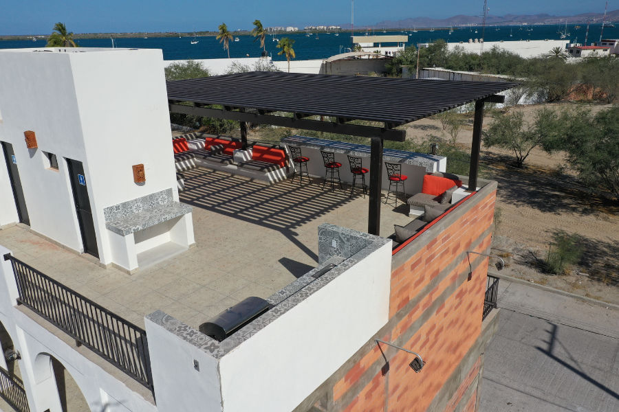 The rooftop terrace offers panoramic sea views, providing a serene setting for evening gatherings or a farewell barbecue.