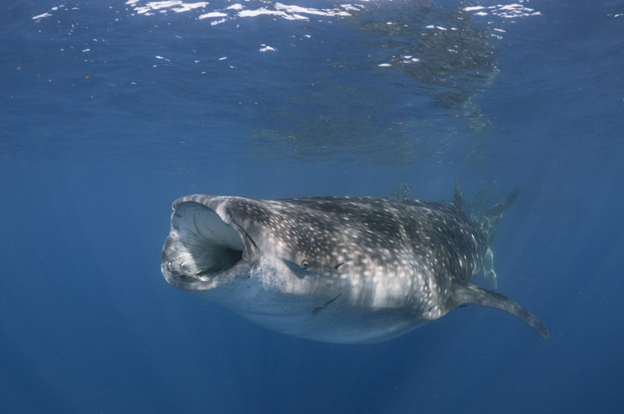 Whale sharks (Rhincodon typus) are found in tropical waters, travel alone but aggregate to feed and mate. They are listed as endangered on the IUCN list of threatened species.