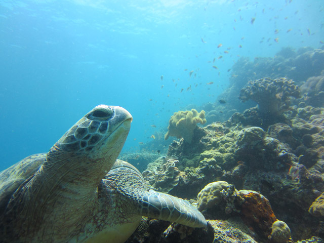 With its on-site dive operation and quick and easy access to numerous wall sites as well as Pescador Island, we couldn't resist the opportunity to take up the option of two dives in morning and one in the afternoon exploring the wonderful coral landscapes, the close encounters with turtles and giant frogfish as well as "Looking into the Blue” for the shoaling fish and larger hunters (no sharks) and, of course, the one special site with the bait ball. With only two other divers on the boat and just the four of us in-resort we were spoilt by both the in-house and dive team - two divers per guide!