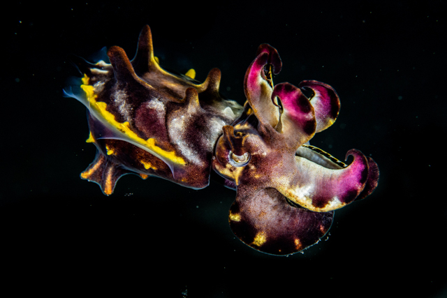 Often some of the most fascinating marine life is found away from the busy, vibrant coral reefs. Take a dive over the black sand of the Lembeh Strait and you may strike upon this vivid and exotic member of the cuttlefish family. The vibrant displays of the flamboyant cuttlefish are not their only trick, they are the only venomous cuttlefish too.