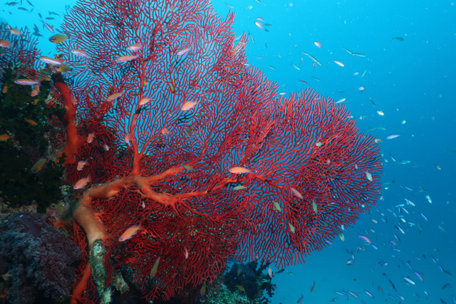 The Namena Marine Reserve is an island surrounded by reef that extends 20 kilometres south into the deeper Koro Sea. Located on the edge of the reef drop-off, it is surrounded by seamounts which make for extraordinary diving. Our dive guide, Geoff, also told us that in-season it is a major migration path for dolphins, whales and large pelagics. From Jean-Michel Cousteau Resort it was about 60 minutes' speedboat ride. The first site was ‘The Chimneys’, aptly named for the two chimney-like rock structures that we spiralled up and around. Both soft and hard corals dominate the structures, with glorious orange anthias decorating the edges of the chimneys. Blood-red sea whips and sea fans grow outwards from the structures and make for nice photos. Looking over my shoulder into the blue, I saw large schools of juvenile jacks, unicorn surgeonfish and snappers.