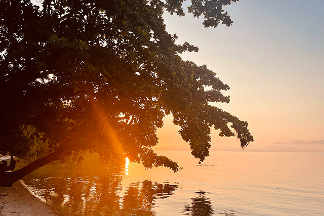 We were met with smiles at the other side by a combination of dive guides and kitchen staff – who had been to the local market to stock up on supplies. They loaded our bags into pickups and we headed for the port. Just 20 minutes later, we were watching a fiery sunset do its thing behind the wake from the boat engines.
