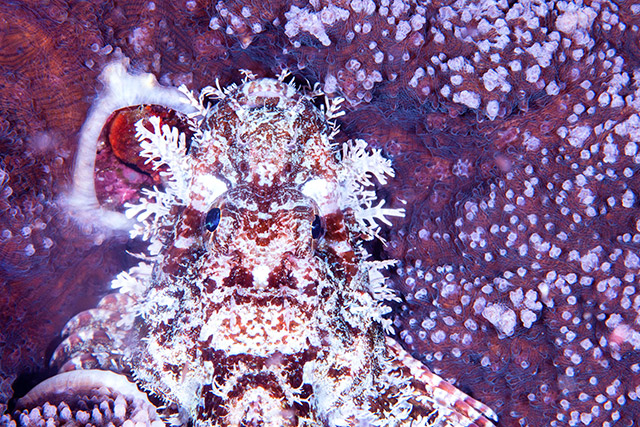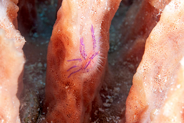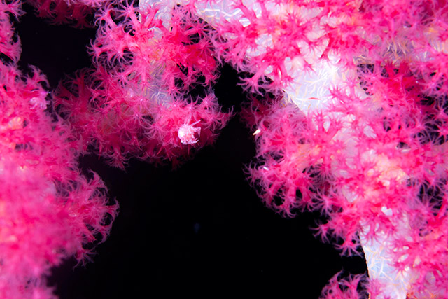 There were dive sites where baby Gorgonia sprouted out of huge Jurassic Porites coral; where purple broccoli corals happily nestled alongside massive feather boa-like sea fans; where long sponges adorned tall coral pinnacles, as if they were tinsel around a Christmas tree; I also saw barrel sponges big enough to sit in! Of course, beauty like this doesn’t come without a price: there were dives where the current was so fast I just hugged my camera and took in the view. How the teeny-weeny pontohi pygmy seahorses clung to their delicate ferns in these currents astounded me!
