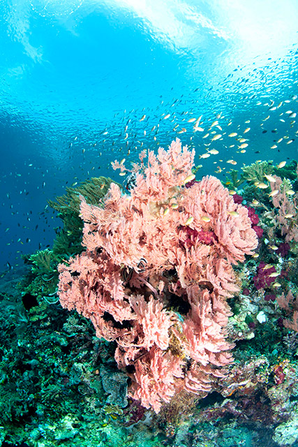 Shallow reefs, shelves, drop offs and corners house a huge variety of coral species, all vying for space to feed in the current. Never have I been on a dive where a coral garden gave way to an alleyway of muck - with painted frogfish and a hairy shrimp - and then yet another shallow reef plateau full of schools of oxeye scad and thousands of chromis. This was at a very special site called Low.