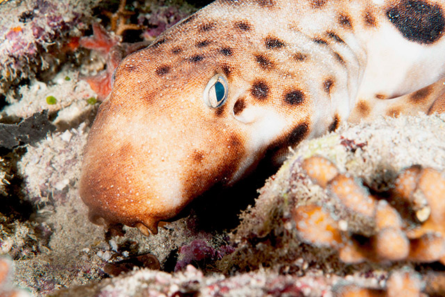 Diving the house reef will reward you with some beefy looking black tip reef sharks, usually swimming in unison. There are gorgeous bright orange and yellow gorgonian fans down from the jetty and very photogenic longfin spadefish. Of course, the night will reveal spider crabs, crinoid squat lobsters, decorator crabs and shrimp. But the primary reason for diving into the darkness is for the Halmahera walking shark (Hemiscyllium halmahera), which was only discovered in 2013. While they can swim, these reef-dwellers like to use their pectoral and pelvic fins as feet as they move across the sea floor in search of tasty crustaceans and smaller fish.