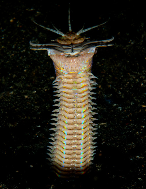 Don’t miss the chance on a muck dive to see the stuff nightmares are made of – the bobbit worm (Eunice aphroditois). Fans of the films Dune, Return of the Jedi and Tremors will revel in being very afraid in the dark of these ambush predators. This long (up to 3 meters) nocturnal worm burrows deep under the black sand waiting for prey to swim over its five antennae. It snatches with deadly fangs, dragging its dinner underground to a grisly death. You would be well advised to bring a long wetsuit!