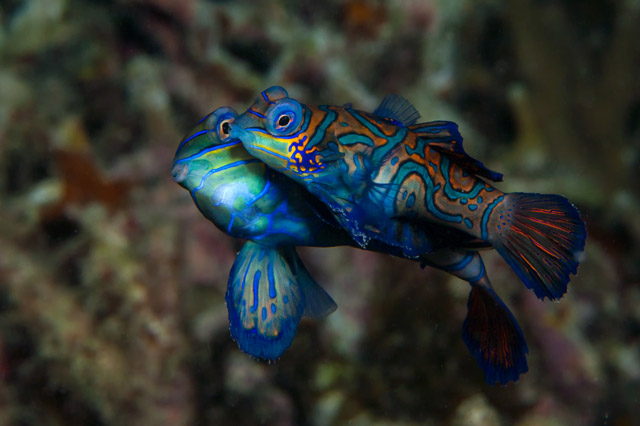 Mandarin fish (synchiropus splendidus) are highly decorated with flimsy, oversized pectoral fins and a cute pointed snout. It’s best to dive at dusk when they are mating. Males hunt around in the hard coral branches for smaller females to dance for. Strobes are not allowed as it frightens them so you will need to rely on your guides sheltered beam to photograph the spectacle. When she is suitably impressed, the female will join her peacock-coloured mate side by side as they shoot up vertically in a split second for eggs to meet sperm.