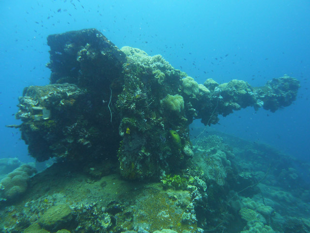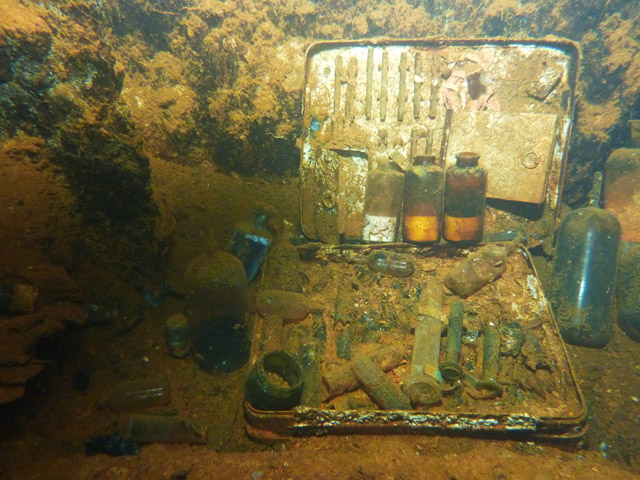 We saw bottles, lots of bottles. We saw porcelain, glass ware, bullets, bombs, shoes and boots, gas masks and medical boxes still containing stethoscopes and syringes. We saw binoculars, range finders, huge 14 inch artillery shells, intact light bulbs and fixtures. We saw hemispherical beach mines, bulldozers, tractors and battle tanks. We dived a submarine (one of a very few Japanese subs within diving depths). We dived a destroyer, a submarine tender, an aircraft supply ship and a bomber aeroplane. We also saw the remains of the Japanese sailors who met a very violent and watery grave. It is important to understand the historical nature of this place, its reason for being, and its place in the record books.