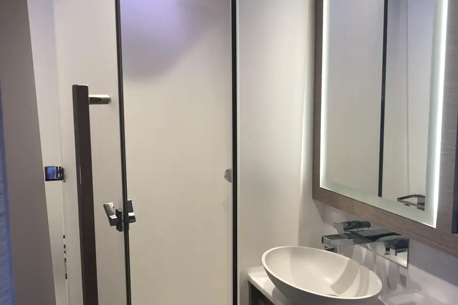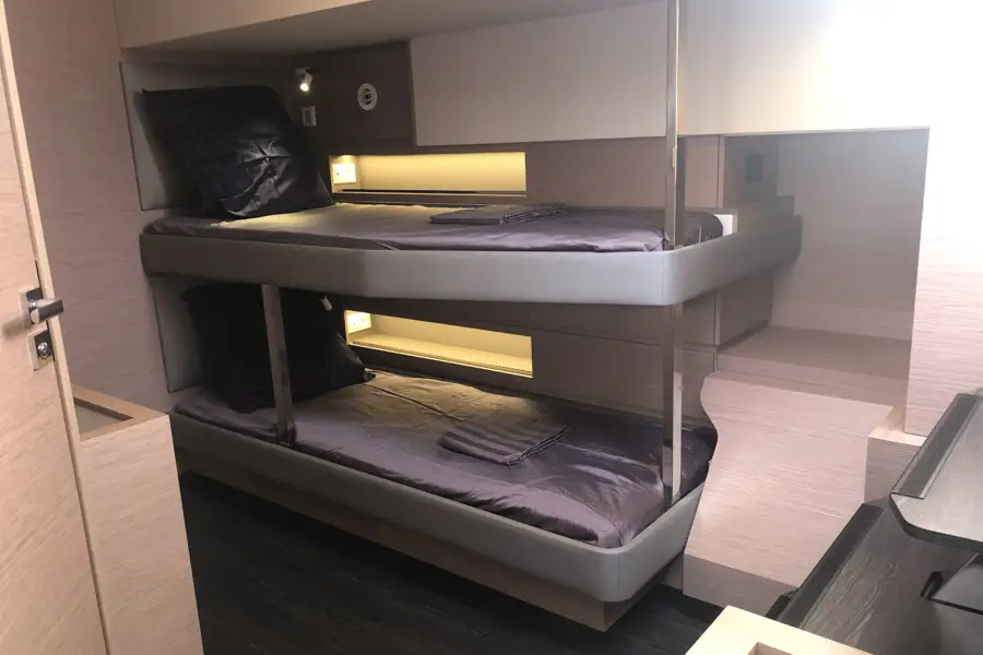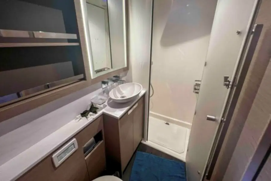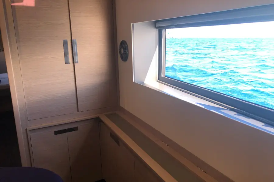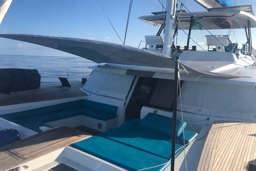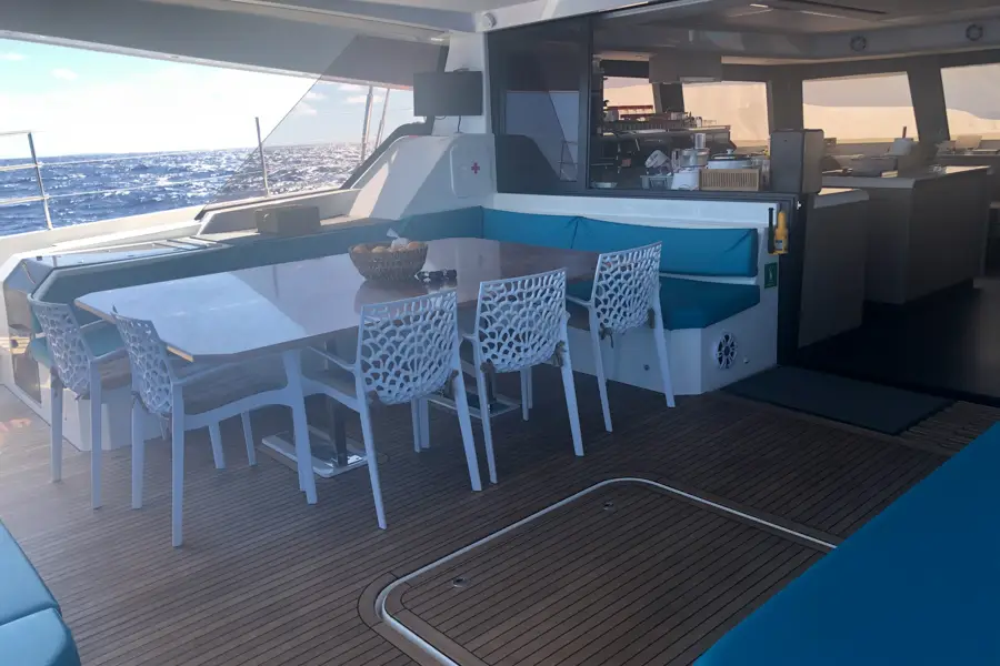 The open U-shaped galley kitchen is situated in the covered, open-air saloon where meals are served. Here there's also a cosy seating, lounger area, small library and cocktail bar. The bow has a seating area and 'trampoline' netting across the two forward hulls, ideal for relaxing in the sun and spotting passing dolphins and other cetaceans. The sun deck has a partially covered seating area and loungers. WiFi is available at additional cost.