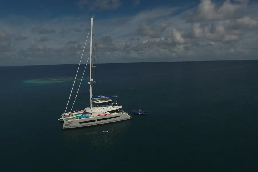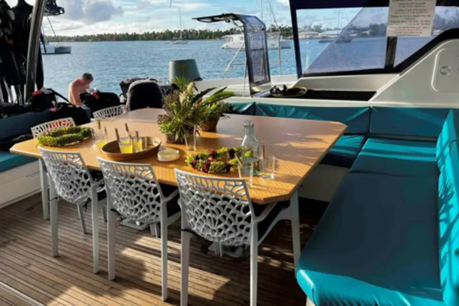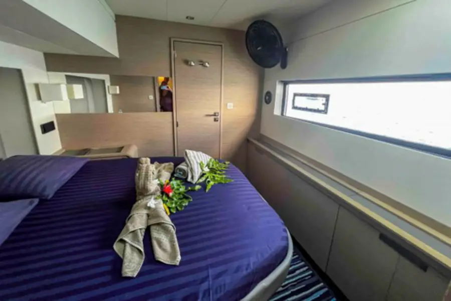 The Aqua Tiki III is an Algeria type catamaran, using a combination of on-board engines and sails. The vessel is French owned and operated, welcoming passengers from around the world. There are five cabins; a twin bunk-cabin and two flexi-cabins which can be arranged as a double or twin with the bed separated by a privacy screen. There are a further two double “VIP Cabins” with rectangular panoramic windows. All cabins have en suite bathrooms, sufficient storage, and charging facilities. Air-conditioning is available for a few hours each day, the cabins are primarily air-ventilated, which keeps them cool.