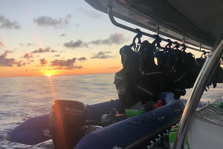 Depending on weather conditions and currents, two dives per day are offered (excluding arrival and departure day). The dive guide speaks English and conducts briefings in English when required. Diving groups are typically limit to five per guide, and entry is staggered to keep each site uncrowded. Dives are either conducted from the supporting Zodiac, which has a ladder, or via the platform lift at the stern of the vessel. Maximum dive time is one hour using steel cylinders; dives can be as deep as 35m to increase shark sightings, which is why Nitrox is free of charge and recommended. A third dive can be discussed locally with the crew and is subject to additional cost. All divers must have their own computer and SMB, and night dives aren't permitted at any time.