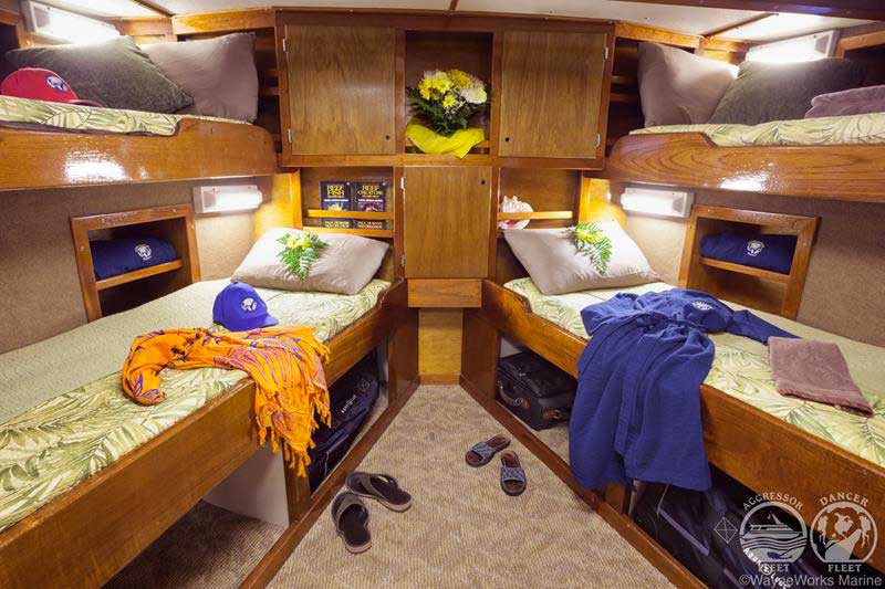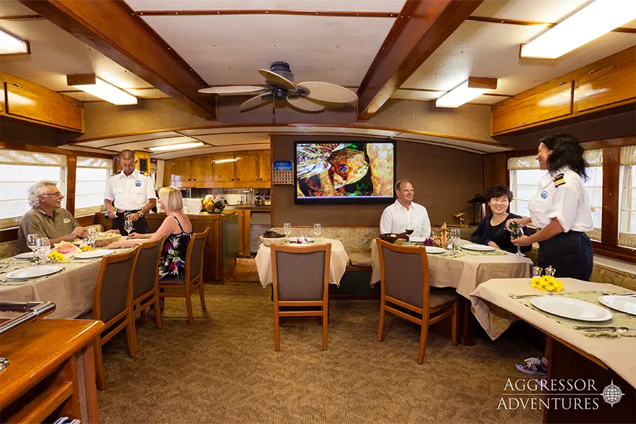 The intimate vessel accommodates up to 14 passengers in five deluxe cabins and one unique quadruple bunk room. All have en-suite bathrooms, a TV with digital media player, and are fully air-conditioned. The salon is a comfortable common area with plenty of room for all to relax after a hard day of diving. Sockets are standard USA and 110v power. As with all Aggressor Fleet boats, there is a purpose built camera table and charge station.