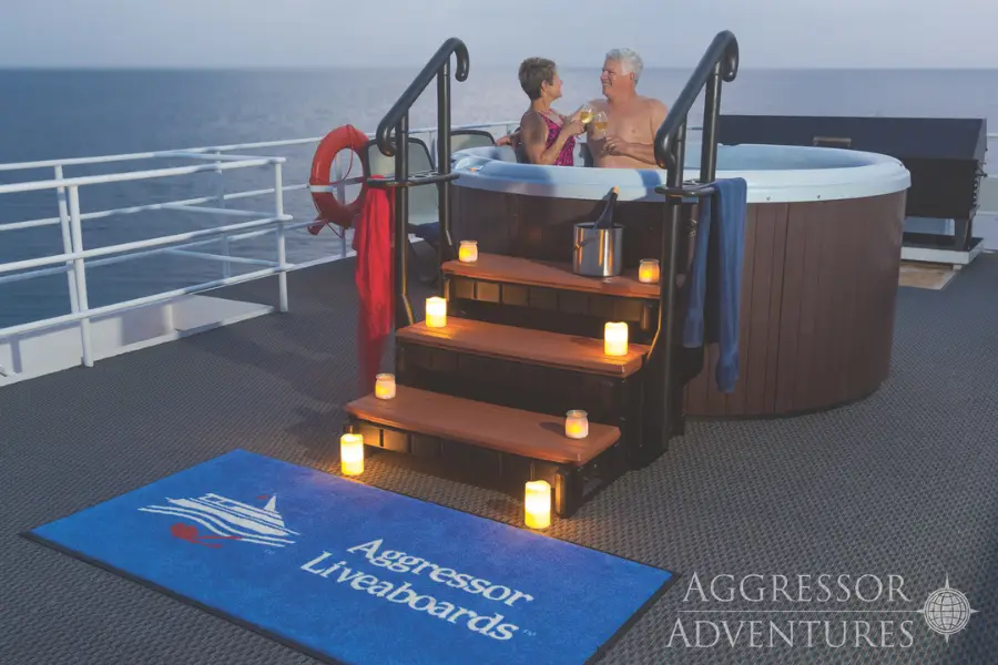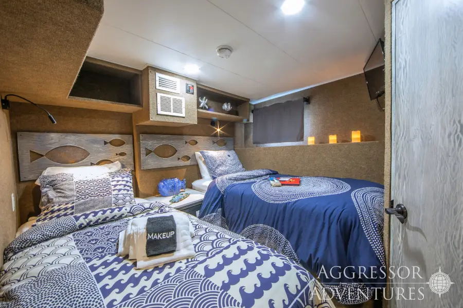 The Bahamas Aggressor II is a luxurious boat accommodating 20 passengers in ten comfortable staterooms. The lower deck features four twin bed (some without porthole) and four deluxe stateroom cabins, the latter of which can be arranged into double or twin beds. There are two balcony suites located on the main deck, accessed via the saloon. The boat features all the modern amenities a diver could wish for, including air-conditioning and private bathroom.