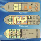 The custom built boat accommodates up to 16 divers in eight cabins with air-conditioning and en-suite bathrooms. Furnished with a spacious saloon and dive deck, voyage durations vary from three to seven nights, starting on a Sunday.