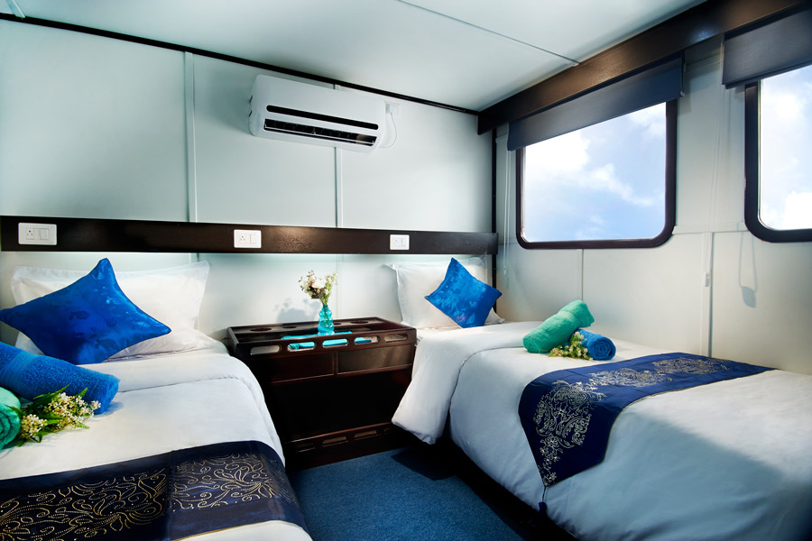 The 32-metre long steel-hulled vessel features nine cabins accommodating up to 16 passengers. There are four premium cabins on the upper deck which can be configured with a twin or a double bed and a further double bed only on the main deck, all with large windows. The classic cabins are located on the lower deck, with small port hole style windows and can also be configured with a twin or double bed. All cabins feature air-conditioning and have an en-suite bathroom plus plenty of storage space.