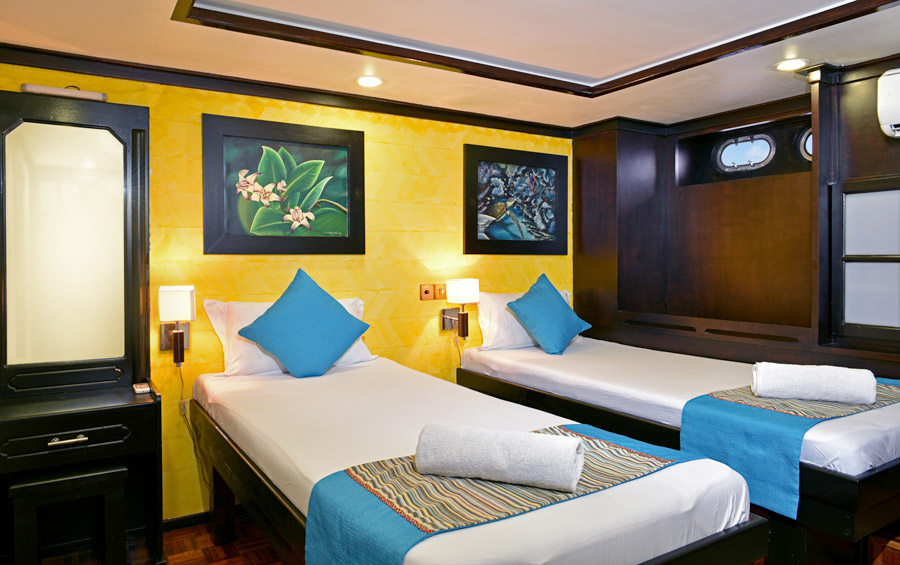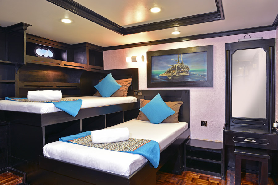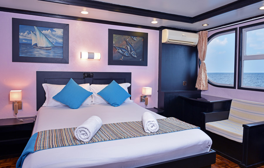 Accommodating up to 24 divers, the generous 36 metre long vessel features nine standard, two deluxe and one master deluxe cabin. All cabins are spacious, with plenty of storage, en-suite facilities and air-conditioning. Standard cabins can be double or twin, while deluxe cabins feature queen beds, an additional single bed, massage shower, and panoramic windows offering ocean views.