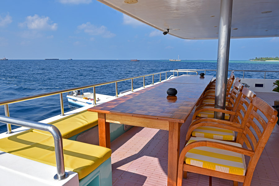Up to three dives per day are offered, with all diving conducted from the spacious dive dhoni. Both DIN and Yoke tanks are available, along with 15 litre tanks if required. Equipment rental and Nitrox are also available for an additional charge.