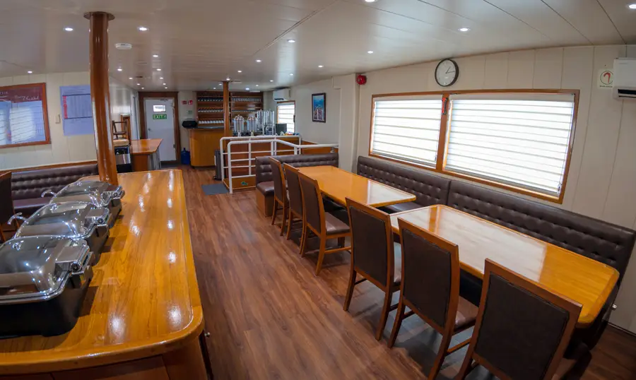 The boat features a main dining saloon and multiple relaxation lounges across the four decks including an indoor area with entertainment system and furnished outdoor areas plus a self-serve bar. All drinks on board including social servings of beer, wine and local rum are complimentary, guests are also welcome bring their own beverages with no corkage fee.