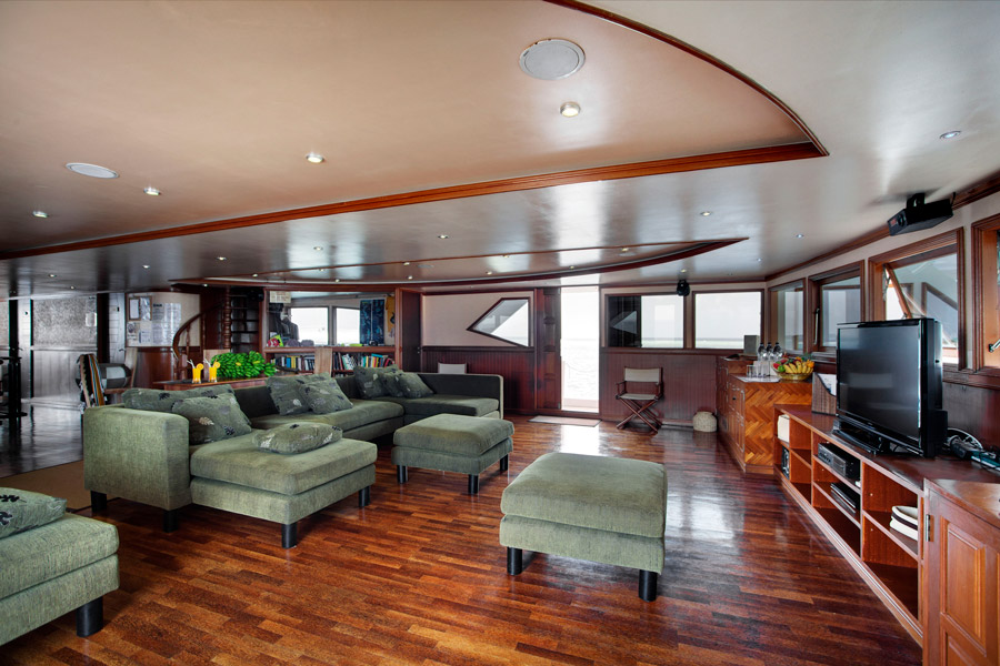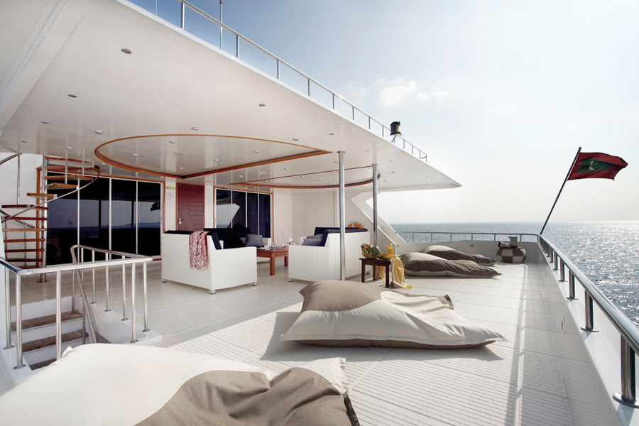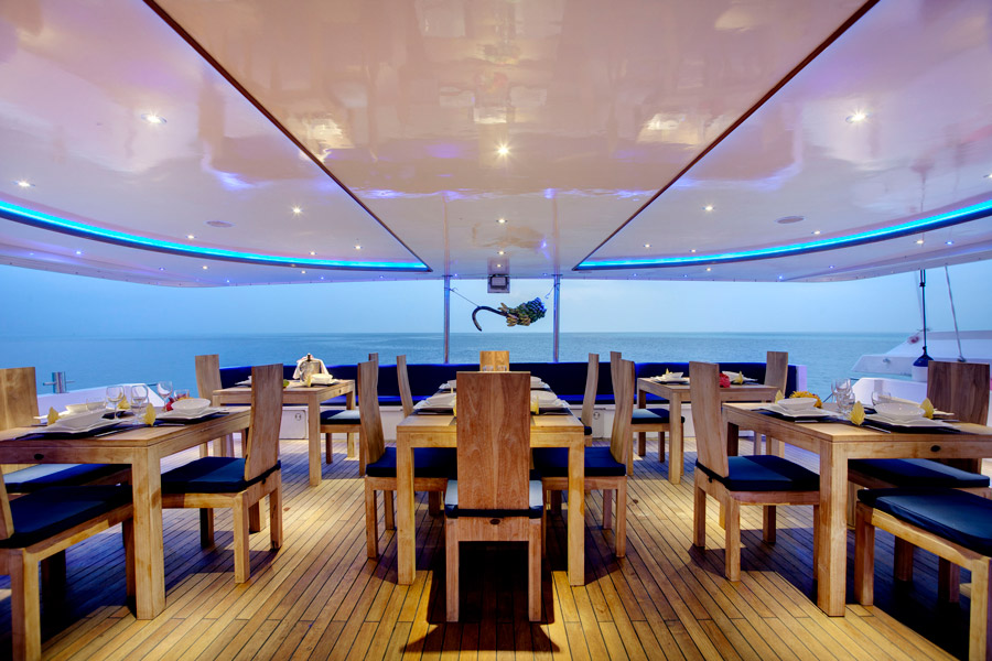 The wooden hulled boat features a restaurant (Italian and Maldivian cuisine), a modern and comfortable bar/lounge, sundecks (with shade), boutique, a spa with a masseur specialising in Ayurvedic treatments and 3G WiFi internet is available (paid for locally).