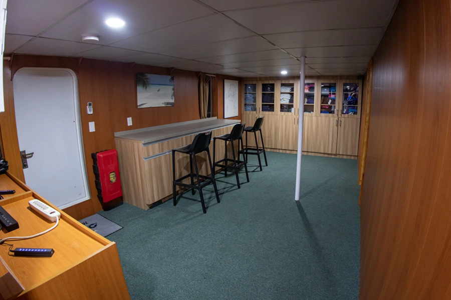There's a generous dining area, sun deck and spacious dive deck. The ‘boatique’ provides an indoor charging station, camera work area suitable for underwater photographers. There's also the boutique where guests can ‘buy the t-shirt’. Internet access is available at additional cost via Starlink.