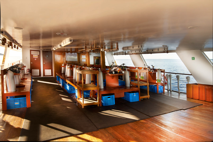 All diving is from the two accompanying skiffs, fully equipped for divers and their needs, and led by an experienced crew with a diver ratio of 1:6. Equipment is available to rent (including 15L tanks) as are private guides. Standard tanks are 12L with DIN valves (adaptors available). The boat is side-mount friendly and has limited support for rebreathers (oxygen refills). Solo diving is not allowed and all divers must be equipped with a whistle, computer and surface marker buoy. Nitrox 30% is available.
