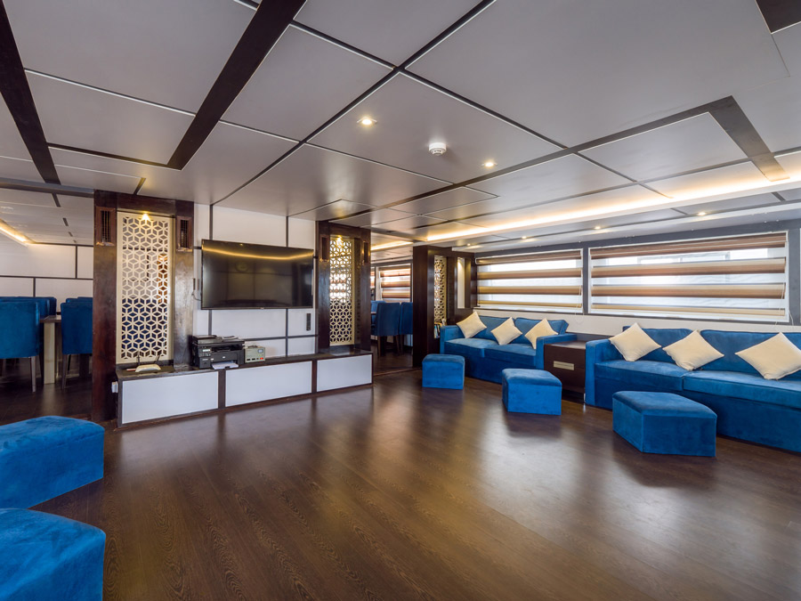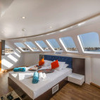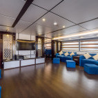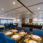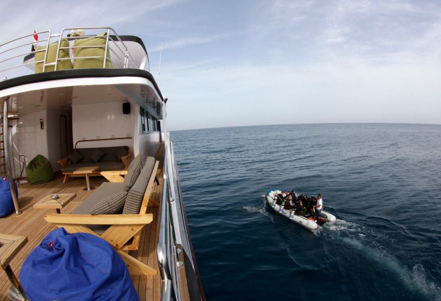 The spacious boat features three sun decks, a stylish salon and dining area (both air-conditioned) where all meals are served (including complimentary red wine with dinner). On board, some coffees, snacks and alcohol come with a surcharge. The dive deck has ample space for all and a platform off the stern. The boat is accompanied by two tenders. Sidemount, rebreather and technical divers are welcome and Nitrox is complimentary for qualified divers.