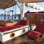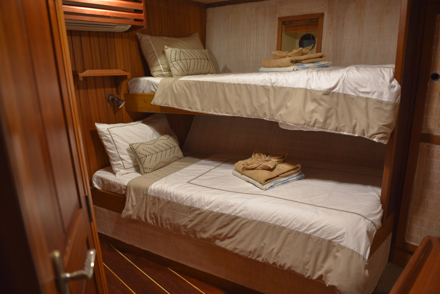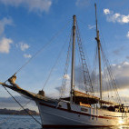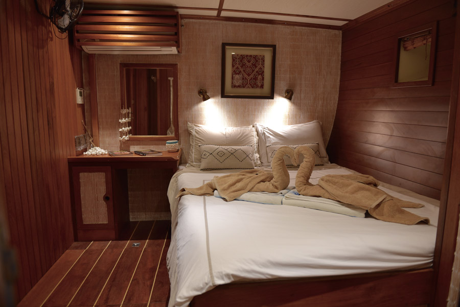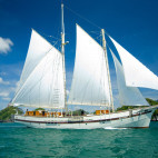 An elegant schooner style yacht, complete with majestic sails rising up towards the tropical sky, the ‘King of the Sea’ caters for her guests in six generous cabins. There are three twin cabins, and a further three double cabins available. Each cabin has individually controlled air-conditioning, along with a fan, mini-safe and en-suite facilities.