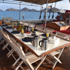 Also on the lower deck is a wonderful air-conditioned lounge area, with a large flat screen TV, entertainment and a mini-bar. The upper deck offers alfresco dining on a central, shaded dining table, along with areas to relax in either the sun or the shade.