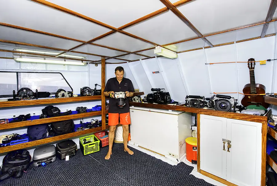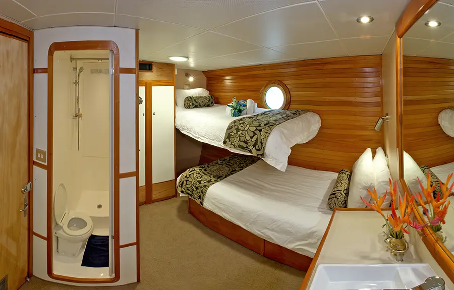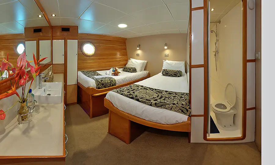 Departures into the renowned Bligh Water on the Nai'a liveaboard are either seven or ten nights and normally depart on a Saturday from Lautoka, just north of Nadi. Accommodating up to 18 guests in nine air-conditioned, elegantly appointed cabins, each with en-suite bathroom, the boat features all the creature comforts of a quality land-based resort. Seven cabins are either a king bed or a king bed divided into two king singles. One cabin has bunk beds and the group leaders cabin (full boat charters only) has bunk beds as well. Nai’a’s facilities include a large sundeck, a spacious dive platform and a dedicated camera room.