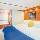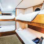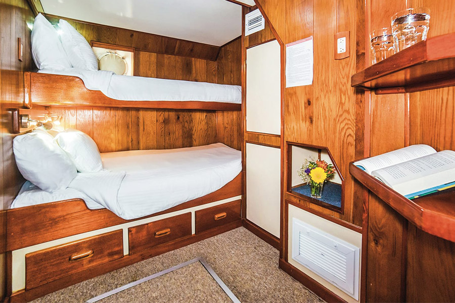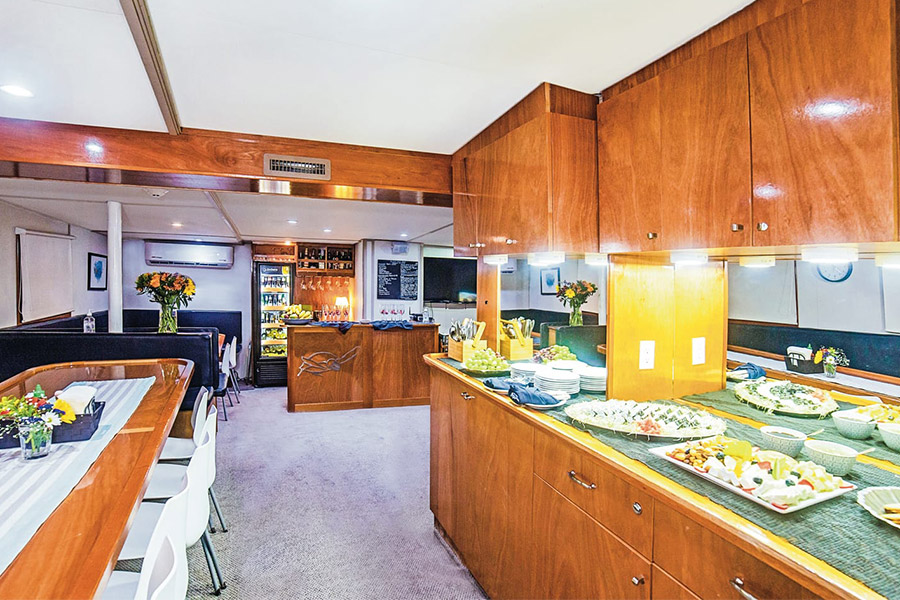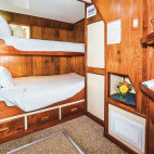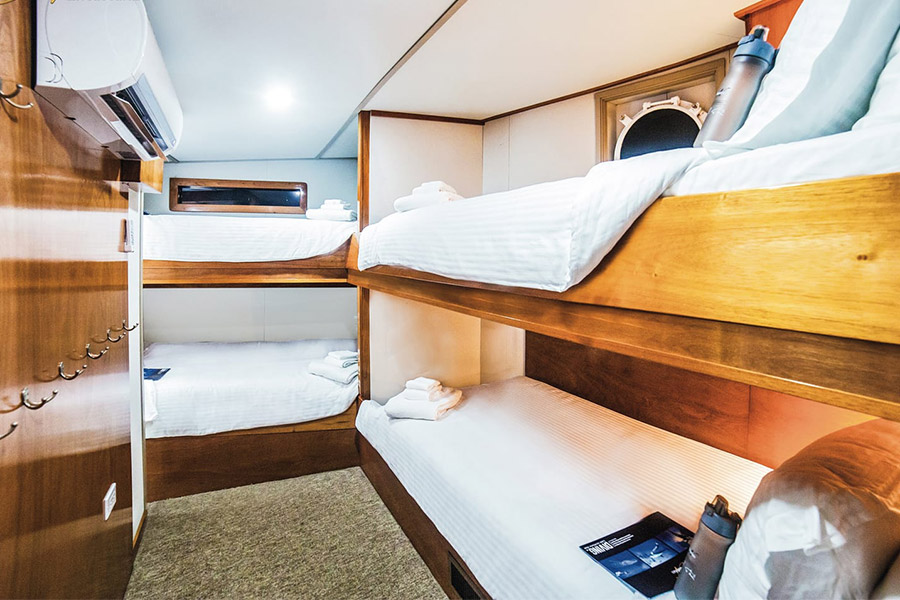 A classic liveaboard, she accommodates 18 guests in three types of stateroom, all with air conditioning, windows and an en suite bathroom. The Emerald suite is located on the top deck with easy access to the hot tub and al fresco lounge. Spacious and elegantly furnished, the configuration can be double or twin bed. There are six double staterooms located on the lower deck: furnished with two bunk beds, these are available for double occupancy. The quad occupancy stateroom is located on the main deck and features two sets of bunk beds.