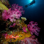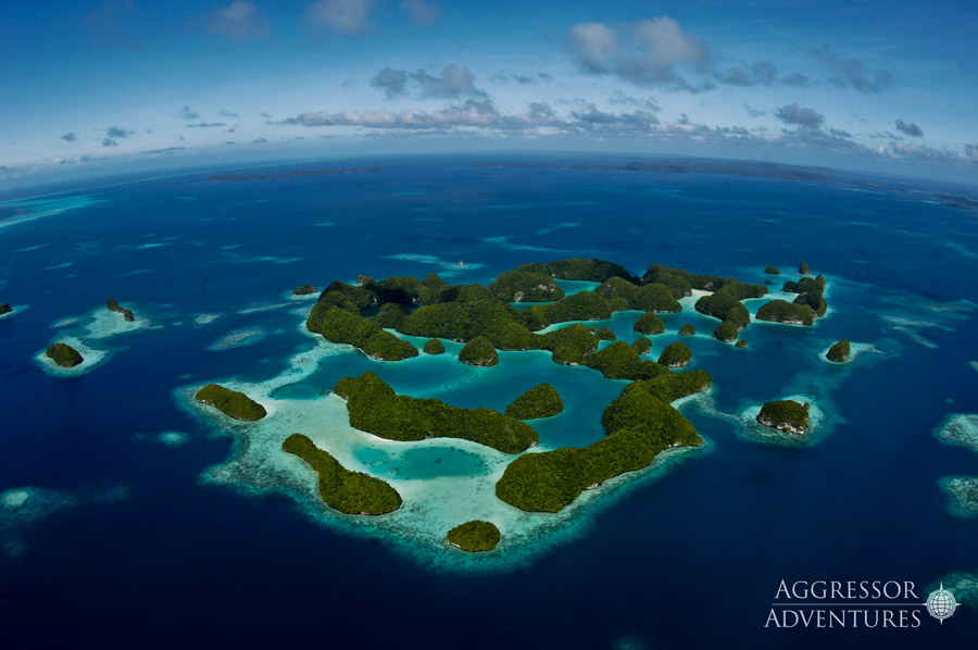 The mushroom shaped rock islands are home to WWll wrecks, grey reef and white-tip sharks in the channels, blue holes, caves and the non-stinging jellyfish of Jellyfish Lake. The walls are covered in soft corals and the currents on the drift dives can be challenging (recommended for advanced divers). Resident manta rays can be found in German Channel and the best encounters are during mating season, Dec-Mar where over 20 individuals have been seen on one dive.