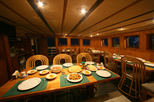 A light breakfast is served before the first dive, with a breakfast buffet available afterwards. Lunch and dinner are a highlight – cuisine is international with Indonesian and Asian influences – and biscuits and cakes, tea, coffee and soft drinks are available throughout the day. After the last dive complimentary alcoholic drinks are served (wine, is at an additional cost).