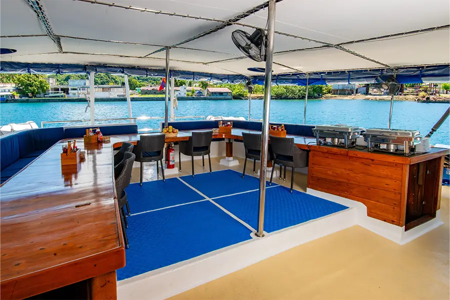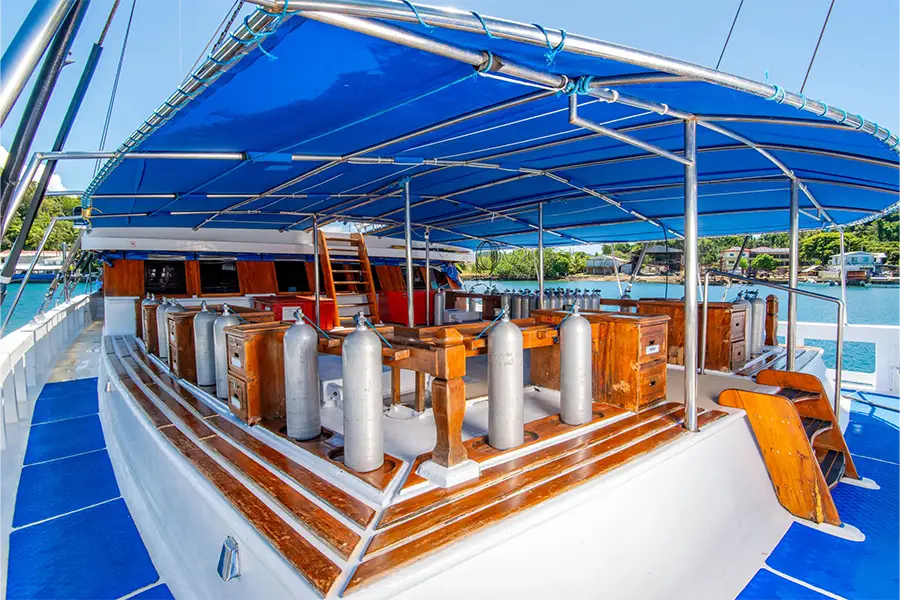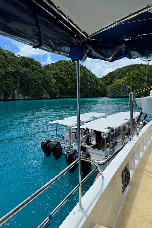 Accompanied by two ten-metre tenders, there are seven and ten night liveaboard cruises departing from and returning to Palau’s capital city, Koror. She sails from the Malakal harbour wrecks to the Ulong Channel, Ngerchong Island, German Channel & Peleliu Island before returning to Koror. During the ten night itineraries she also visits the furthermost island of Angaur and dive sites to the north at Badeldaob Island.