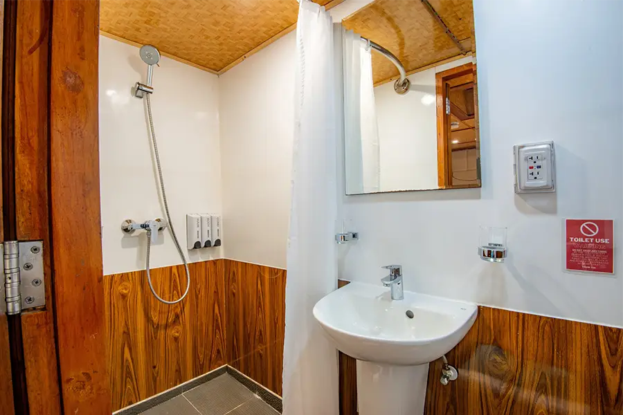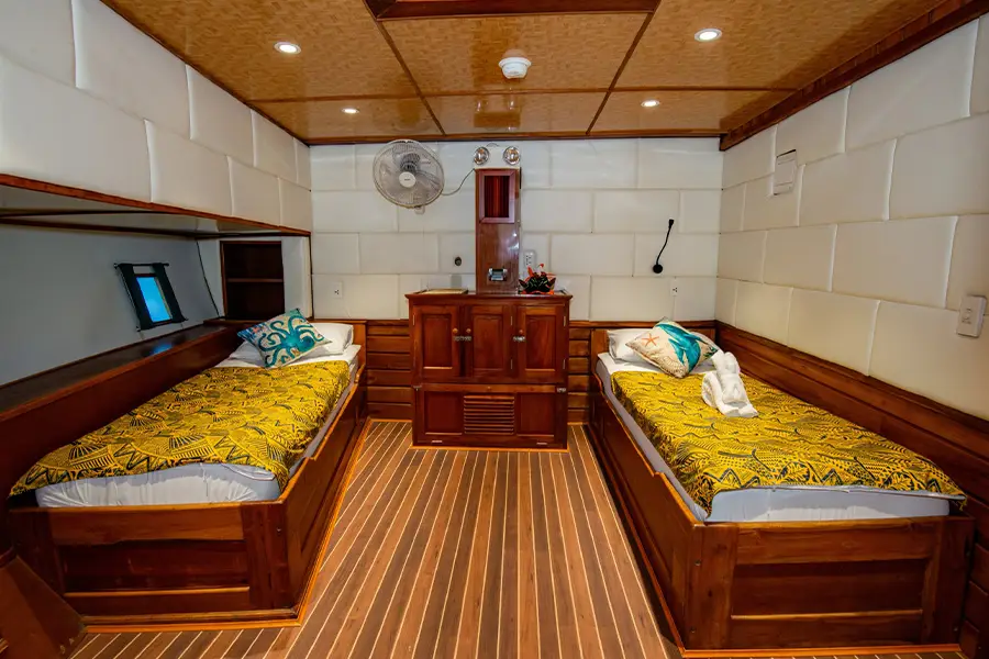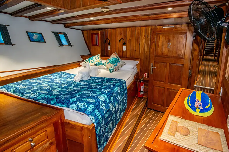 The cabins offer flexibility and can be used as twin or double bedded rooms. The dive deck and dining areas are spacious and comfortable and there are designated areas for charging and preparation of camera and video equipment. There are eight large air-conditioned cabins accommodating a maximum of 16 guests; each come with their own audio-visual entertainment system and ensuite bathrooms with hot water. All rooms are lavished with luxury extras. A massage service is also available to make for a truly relaxing liveaboard holiday.