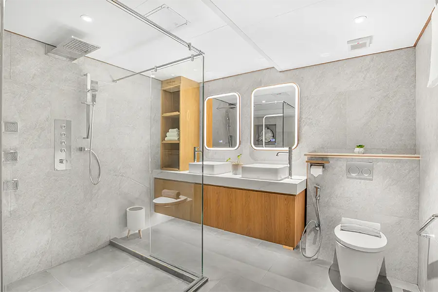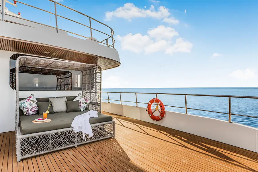 The nine cabins on board the Solitude Gaia provide each guest with ample space to unwind. The two lower deck “Interior” cabins can be flexible with either a double or twin configuration. On the main deck, the four “Ocean View Cabins” feature elegant, elliptical windows; two cabins are flexible while two are fixed doubles. On the upper deck there's another “Ocean View Cabin” (double) accompanied by the two most spacious cabins, the “Ocean View Staterooms”. All upper deck cabins have the convenience of direct access to the companionway via the glass entryway, while the Staterooms can yield to tranquillity in their private bow sun deck. Each cabin has air-conditioning, generous storage, and universal plug sockets. En suites enjoy carefully chosen amenities including bathrobe, towels, essential toiletries, and hair dryer.