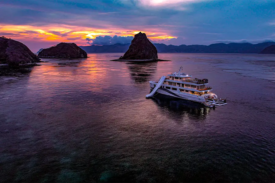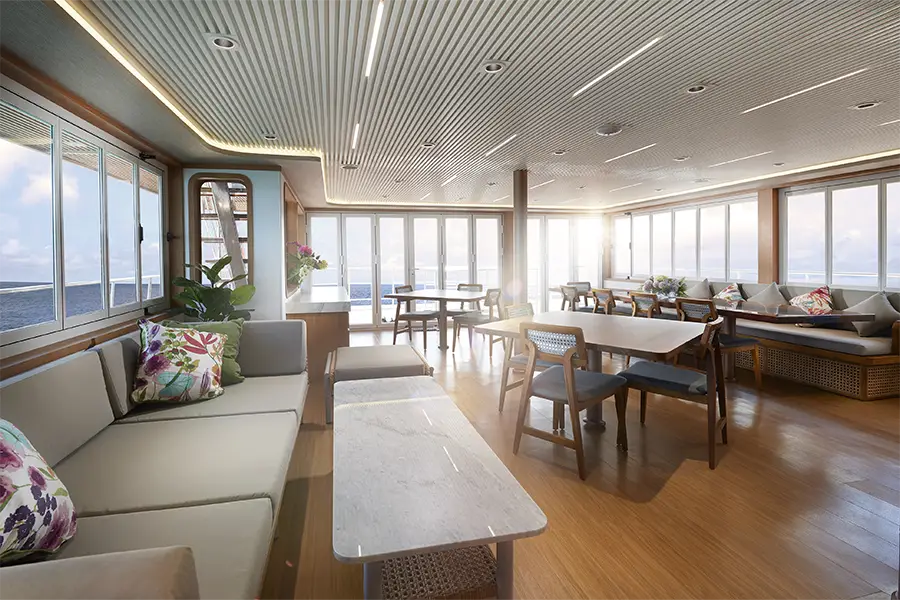 The Solitude Gaia liveaboard is crafted to share the passion of ocean that each passenger holds. The interior’s curated decor exudes openness, with soothing neutral tones, comfortable elegance, and subtle touches of luxury. The sumptuous spa suite, complete with freestanding oval bath, grants serenity amidst the ocean’s rhythm. Each dish is designed to utilise locally sourced ingredients and techniques. Meals are served in the upper deck dining area, the wall-to-wall windows offer a peaceful, panoramic view across the water. The steel hull and aluminium superstructure creates a lower centre of gravity, making the vessel incredibly stable.