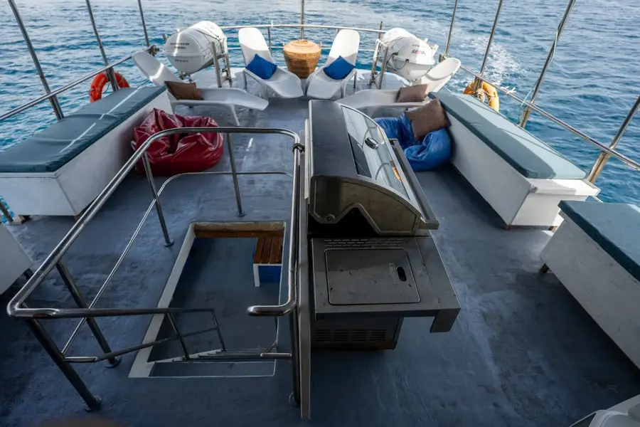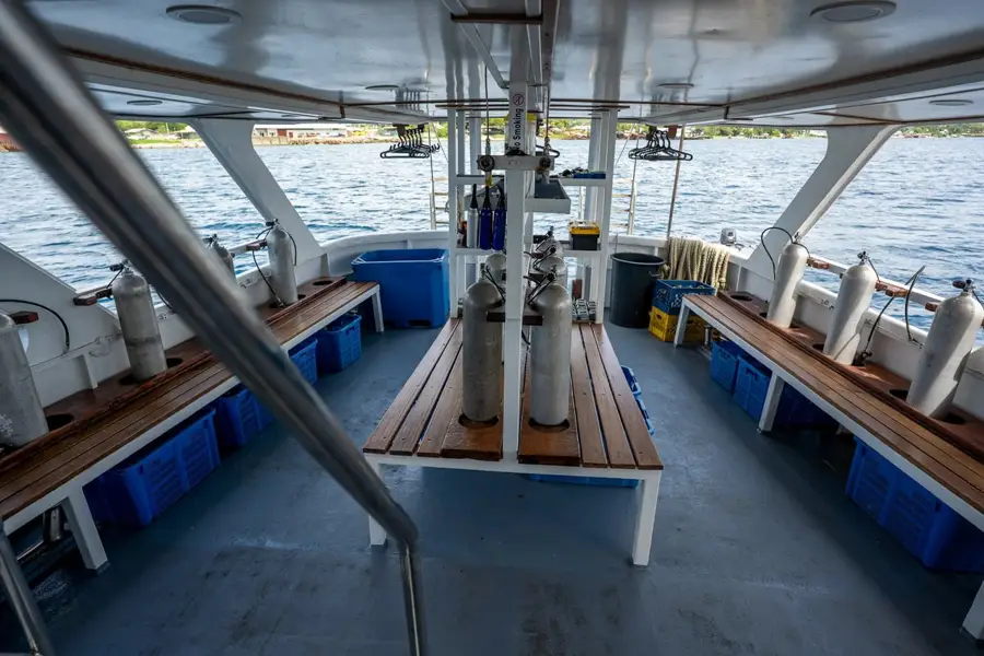 Dive equipment is set up and stored on the rear of the main deck. All guests are allocated an individual set up station, with under bench storage, and can take advantage of the on deck shower hoses. There's a large rear dive platform with two ladders, and two supporting tenders. The vessel is equipped to cater for recreational, technical, and rebreather divers with sufficient notice, there are also dedicated tec only sailings.