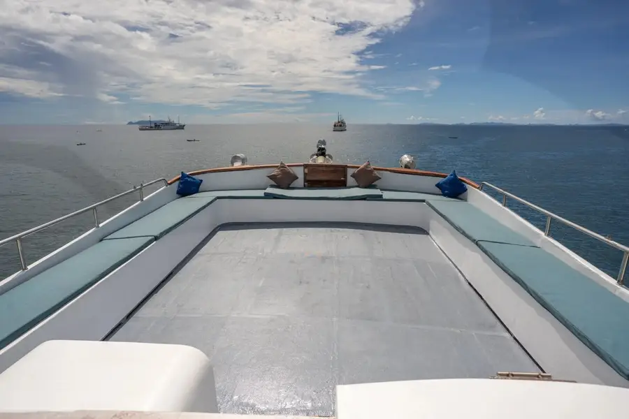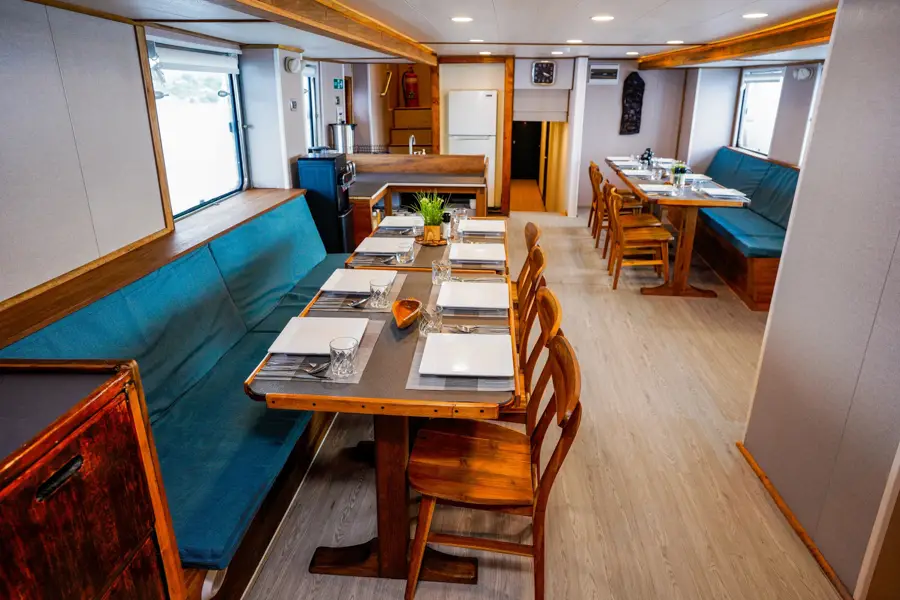 Communal relaxation areas are split between the middle and upper decks, with a spacious indoor dining area on the main deck. There's a camera set up station, with guest storage drawers, lounge bar with comfortable seating and TV, plus a shaded outdoor seating area and a sun deck. The Captain welcomes you to join him at the fly-bridge, from where you can soak up the stunning views of the islands!
